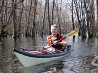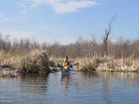 We paddled along the southern shoreline of Constance Bay, exploring the flooded woodlands. We poked our way through the tree trunks, encountering ducks and muskrats around just about every turn. We were drawn to head up Constance Creek, which as always looks more like a river in some parts than the tiny weedy creek it will become in summer. The water was cloudy in this section, and you could not see more than a few inches below the surface.