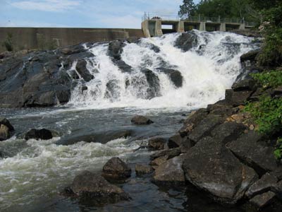 It wasn't a very long hike, so we decided to finish what we started the day before, and check out the falls (strangely enough, also called the "High Falls") on the other side of the York River dam. It was a short drive on a road suitably known as "High Falls Trail Road" and we found ourselves just a couple of hundred feet from where we had kayaked the day before. The falls here are pretty impressive, and the area below is particularly beautiful, with rocks, logs, and moving water mixed with pools of calm.