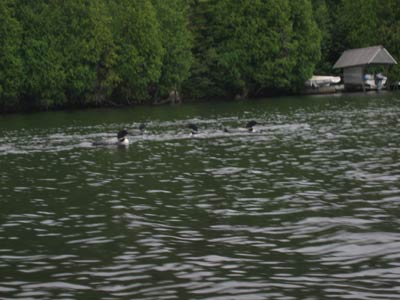 A very light rain was falling, but fortunately Keenan had purchased a special waterproof case for his digital camera. He put the camera in movie mode and started to film them, and the timing was amazing. Just then a powerboat started coming towards us along the same shore. Julie went to get in front of it to direct the boat out into the lake, and in the meantime the loons all started making a racket! They can make four basic vocalizations: the yodel, hoot, wail, and tremelo, and we are guessing it was mostly wails and tremelos. The audio from the digital film is not too good because the camera was inside a case, but you can certainly hear it well enough to appreciate the scene. We might post the video one day if we have the server space to spare.