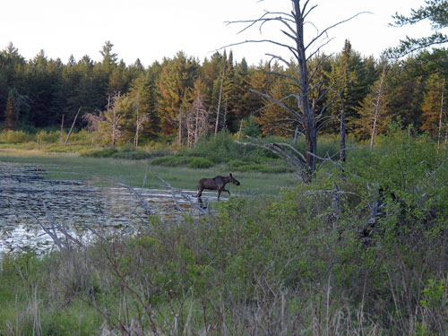 It was back on the road and hoping to see another black bear. No such luck, but returning to the bridge and marsh area, the same bull was trotting right down the road! We stopped, and he slowed to a walk before idling down a bank and into the swamp. He made some sort of noise and it sounded like he got an answer. We postulated that he was signalling to a mate, and sure enough, a cow came sauntering out of the woods to join him. We weren't able to get a picture of them together, but it was great fun to watch them travelling across the swamp. The female was quite curious about us, looking back frequently with ears pointed like antennae, but exercising no urgency in her stride.