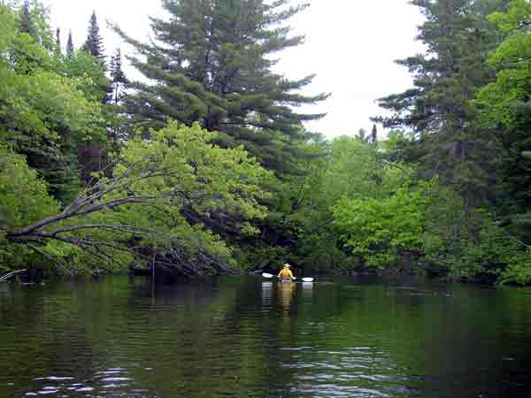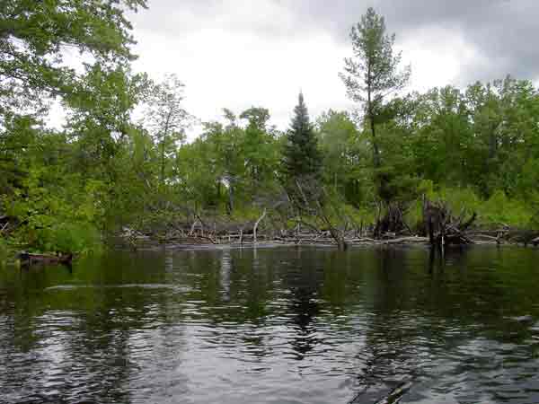 The section from the end of the swifts down to Round Lake suffers unfairly from such characterizations as "tedious" (Chrismar) or "a major problem" (Callan). Yes, it is true, there are many twists and turns, but we found this to be the best stretch of the entire 50km that we covered between this trip and the previous one. Although Callan, Runtz, and others are clearly charmed by the creek-like section between Basin Depot and Couchain Lake, it is so small that you spend most of your time concentrating on keeping your bow out of the brush rather than enjoying the scenery.
