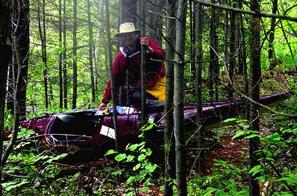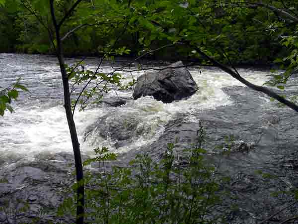 We had no choice but to drag the yaks up the steep embankment, where quite a nice path was available. We walked through the woods to a small bay off to the side of the bubbling bottom of Jack's Chute. We both stared in horror at the standing waves and huge rocks. This was no place to be navigating with a 17-foot solo craft...whether being paddled by an expert or not!
