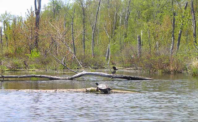 We had a bit of trouble finding the first portage site, but as a result we bumped into a huge turtle sunning on a log. We finally located the portage (it appears that the location is supposed to be signed, but the sign has fallen off) and got out to take a look. The distance was reported as a scant 100m in the Mapbook, but it is easily 600m. However, the trail is very smooth and would have posed few problems. But looking into little Killenbeck Lake, we decided to stick with Charleston.