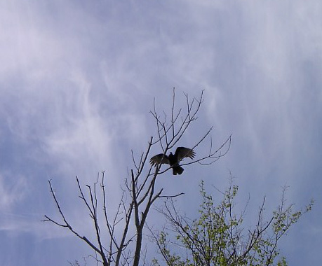 We headed north along the shoreline that boasts Tallow Rock Bay Trail, passing by some of the interior campsites available in the park. We paused brielf in a small rocky bar to observe a pair of large birds high atop the trees. They turned out to be huge turkey vultures, and as they took flight Keenan snapped a nice photograph.