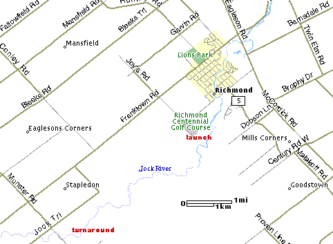 After last week's excursion, we were excited to return to the Jock River and try a new stretch before the water levels drop and a decent trip becomes impossible. Having driven down Joy's Road at the south end of Richmond to the water's edge last time out, we thought we would try it as a launch for a return trip in the direction of the Riverbend golf course. (Aside: Riverbend takes water from the Jock and has applied to take more, which raises obvious concerns given that the river is already reduced to a puddle in some spots during the summer).