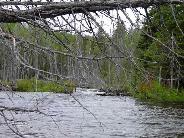 The current grew a bit stronger as we turned north, and a high level of beaver activity became obvious, with a number of Jock-like swifts created by their work. We soon came upon a second road, and this time the sides of the bridge were partially submerged. The lift-over and re-entry were somewhat awkard due to the current, but we were both getting increasingly interested in seeing just how far we could continue on.