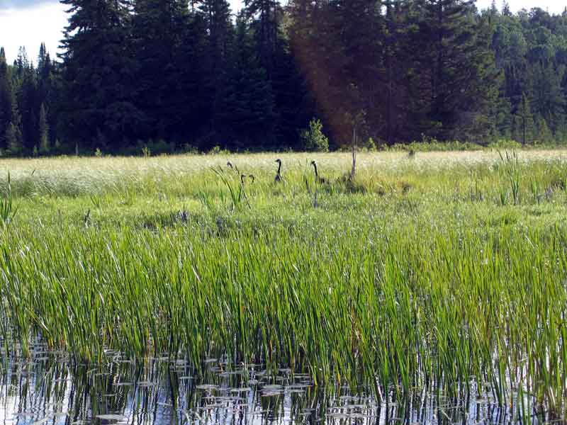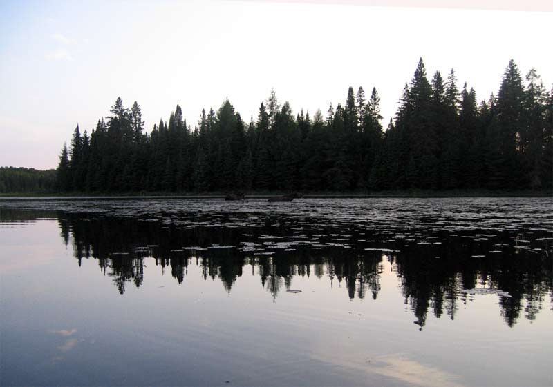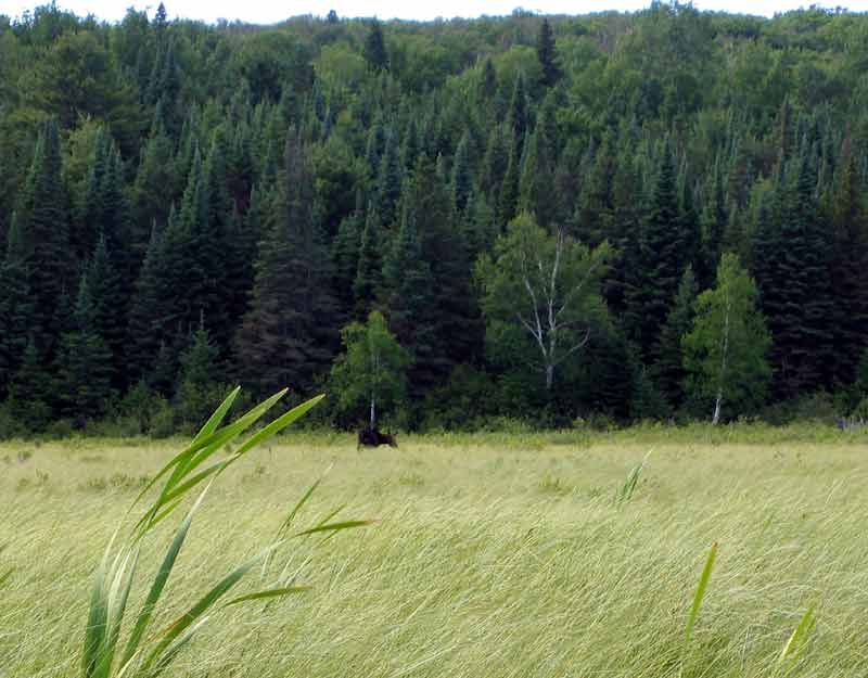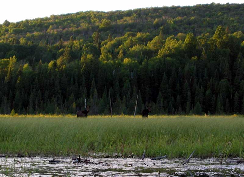 dehydrated foods and set off for the creek in the early evening. This is a pretty big creek and quite a huge wetland area. We had gone perhaps two kilometres before encountering our first moose. He was easily visible to the naked eye but set well back in the grasses on the edge of the forest. There was a canoe already set up in the weeds taking pictures, so we moved on. We saw only one other canoe (no kayaks) within a few minutes, and then nobody else for the rest of the night.