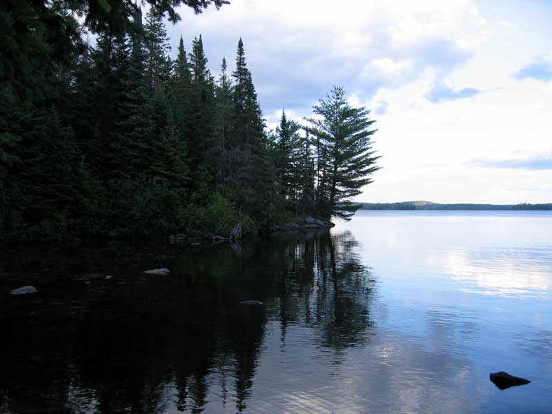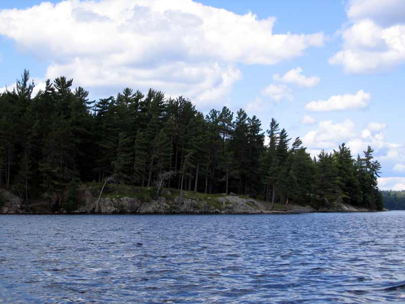It was a wickedly windy day. Paddling east out of the north arm we had big waves washing over us from the southwest, making tracking a bit difficult. When we turned south it was in our faces. It got worse when we started crossing the big bay...nasty winds from the southwest producing the occassional splash right over our heads. There were a lot of canoes out on the water and most of them starting heading for shore. Amazingly, we spotted a number of them without life jackets. Not too bright. Someone drowned after their canoe capsized the previous Saturday.