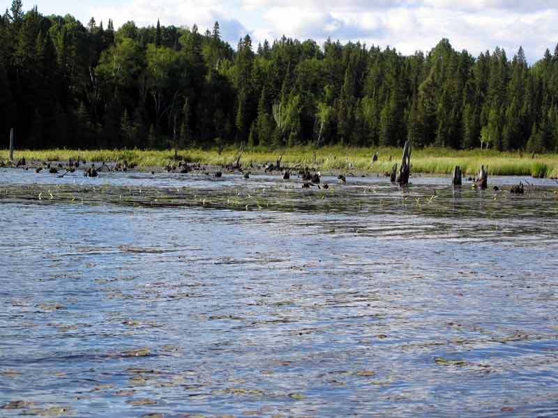 seemed to be little more than a piece of angled granite, so we defaulted to our last choice. The great news was that it was located on a nice little secluded sandy bay with an easy landing and there was lots of room for a tent. The good news/bad news is that it was set on the edge of a thick forest and adjacent the swampy areas of Hailstorm Creek. The creek was to be our main area of exploration, so the proximity was good news...the bad news was that the mosquitos were unbelievable. We both hate wearing bug repellant, so it was a matter of wearing head nets and covering up. Yes, we still got bitten dozens of times, but without those nets...it would have been ugly.