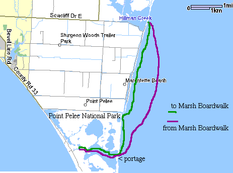 DAY 1 (KAYAKING ON LAKE ERIE AND IN POINT PELEE PARK) Finally, ready to go Hey. that's where we are staying Portage marker for entering the park Beautiful flower Scooting through the small channel Heron in flight Barely enough surf to play Relaxing after a good day DAY 2 (WALKING IN POINT PELEE PARK) Southernmost land mass in Canada Together on the tip Gorgeous sunset DAY 3 (KAYAK/WALK: LAKE ERIE, MIDDLE ISLAND, PELEE ISLAND) Inviting sunrise We're going to kayak in the same water as you? Starting out from Fish Point beach Our distant destination Arriving at Middle Island Strong island foundation Barf missile The puker Lots of room at the inn Sharp teeth no match for hungry cormorants Ready to go back Snake sighting Miami mist...in Canada? Lighting the way Biggest operation on Pelee Island DAY 4 (PADDLING IN HILLMAN MARSH) Julie in the marsh Egret in flight Bald and beautiful |