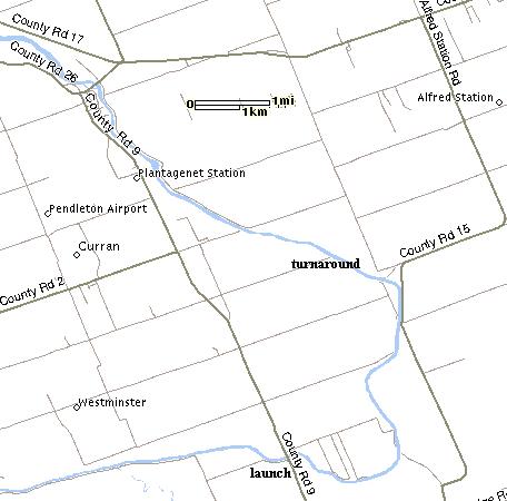 Looking at a map of Eastern Ontario, if you look east of Ottawa, there is just one major watershed, which is the South Nation River. We hadn't been able to find out much about it from the usual investigative techniques, but we did get a list of launch sites, and chose a section that would take us close by the Alfred Bog, with the hope of encoutering some interesting wildlife.