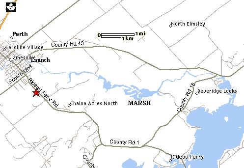 About 100 metres from the basin to the southeast is a metal-framed bridge on Beckwith Street. On the south bank there is a curling or skating club, which seems to be closed in the warmer months. Between it and the river about 20 feet along the bank is the remnants of an old dock that served me well as a launch site. The club has a large parking lot on the other side of the building.
