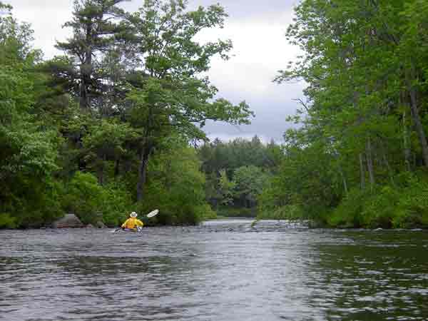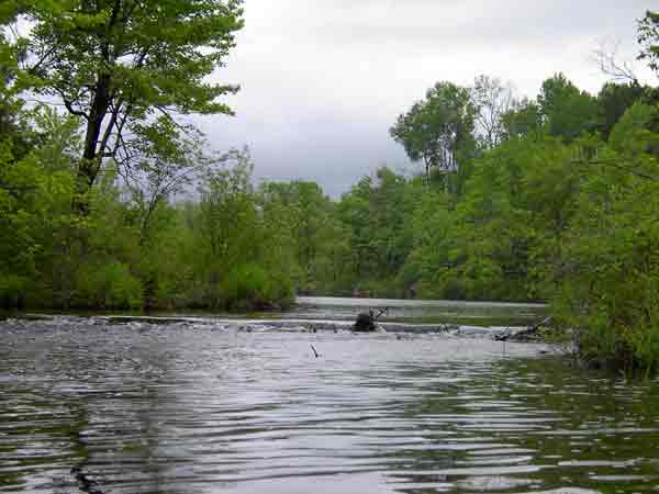 The three sets of swifts are a lot of fun, and can certainly be run. On the second set (which is the second set of fast water by any description) watch out for the submerged log jutting out from the left side. At this time it was about two inches under the water, and Keenan smacked right into it, which instantly knocked his kayak sideways. He battled for quite a distance but it was too shallow to roll and too fast to right with a paddle thrust. He held on for a long time before giving in to the inevitable. By hanging onto his paddle throughout, he earned some scratched up knuckles and a chipped fingernail, but nothing too serious.