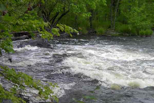 We had no choice but to drag the yaks up the steep embankment, where quite a nice path was available. We walked through the woods to a small bay off to the side of the bubbling bottom of Jack's Chute. We both stared in horror at the standing waves and huge rocks. This was no place to be navigating with a 17-foot solo craft...whether being paddled by an expert or not!